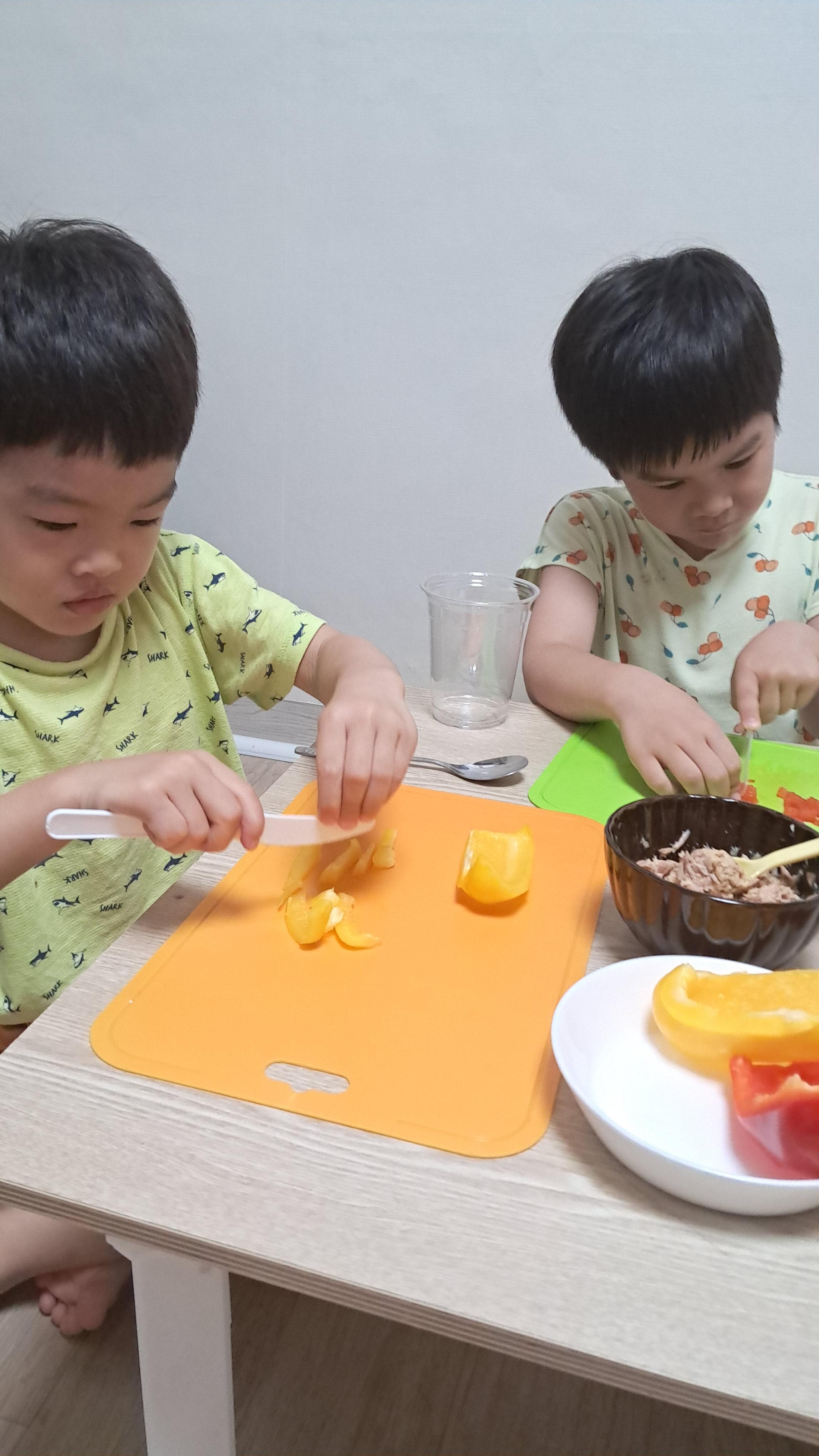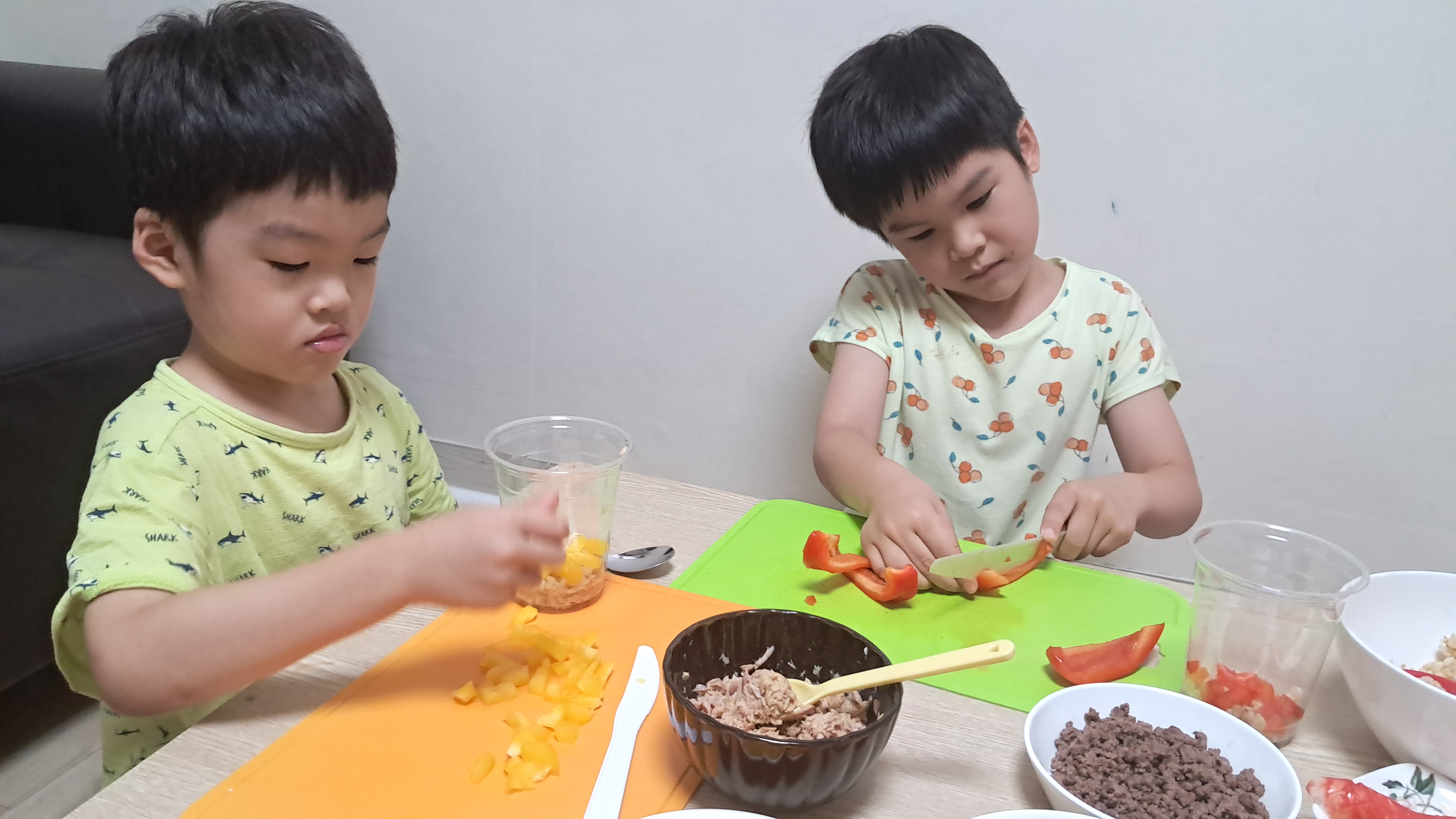 첫째는 빨간색 파프리카를 썰고 둘째는 노란색 파프리카를 쓱싹~~ 쓱싹~~!!!