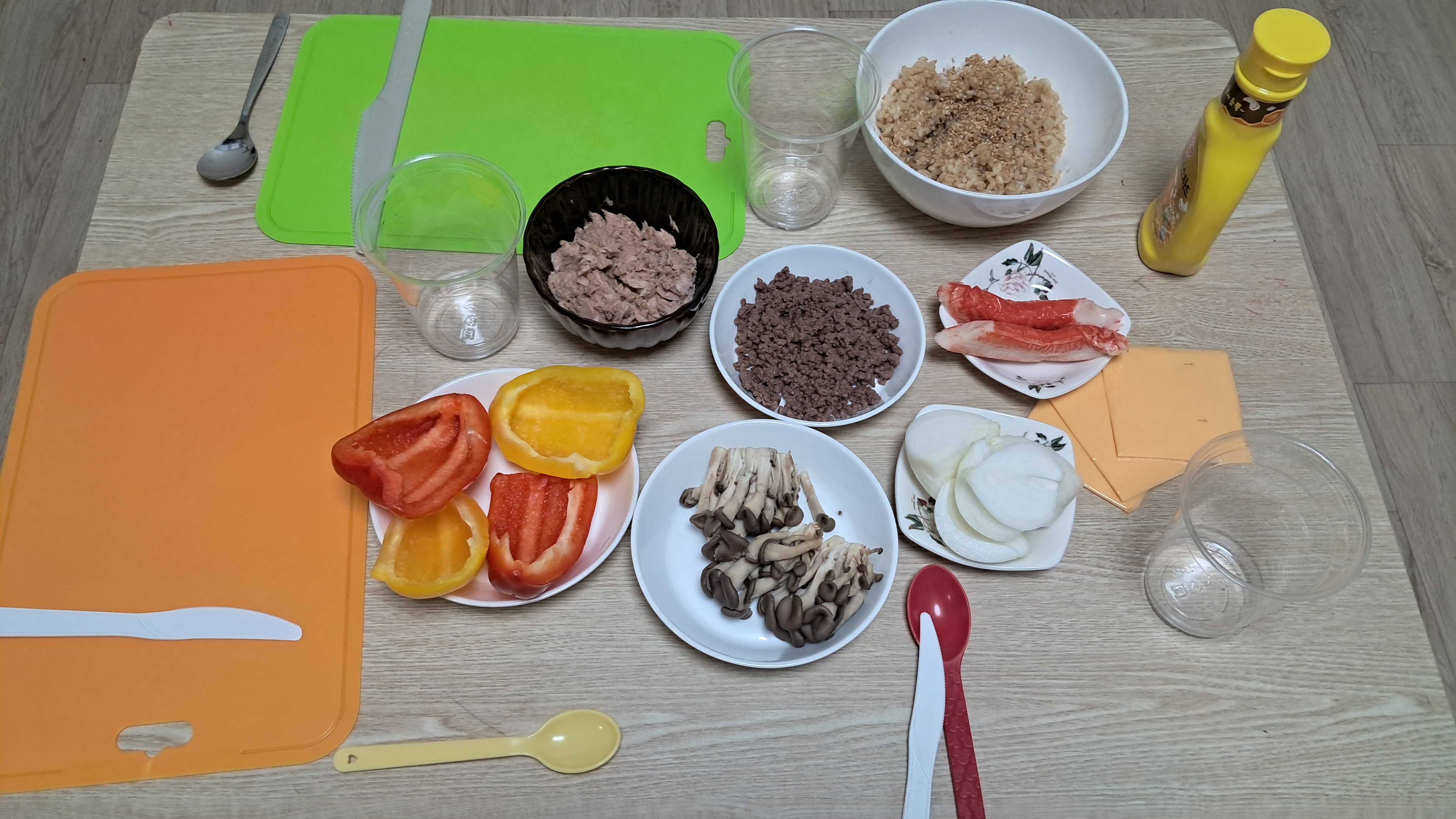 기본으로 색깔을 내줄 간단한 재료만 있어도 된다 파프리카나 당근, 고기 대신 스팸, 버섯 대신 브로콜리도 괜찮다 진짜 아무거나 있음 된다ㅎ